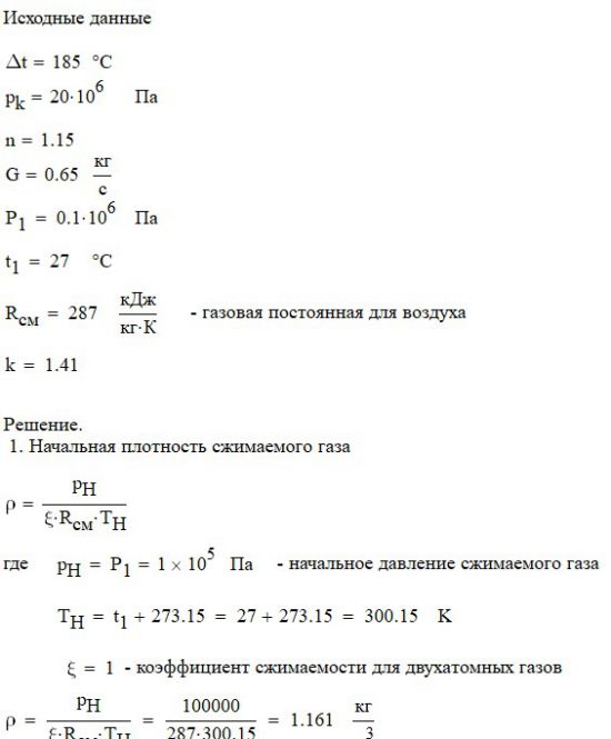 Произвести термодинамический расчет многоступенчатого поршневого компрессора, производящего G , кг в секунду сжатого до давления Рк воздуха, если предельно допустимое повышение температуры газа в каждой ступени Δt, а сжатие происходит с показателем политропы n.