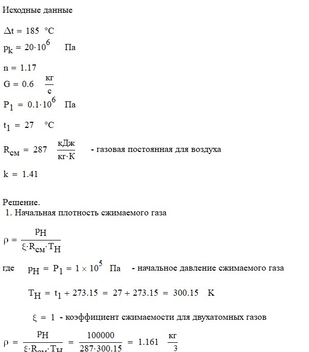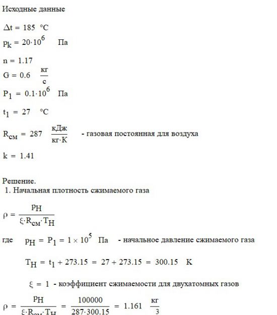 Произвести термодинамический расчет многоступенчатого поршневого компрессора, производящего G , кг в секунду сжатого до давления Рк воздуха, если предельно допустимое повышение температуры газа в каждой ступени Δt, а сжатие происходит с показателем политропы n.