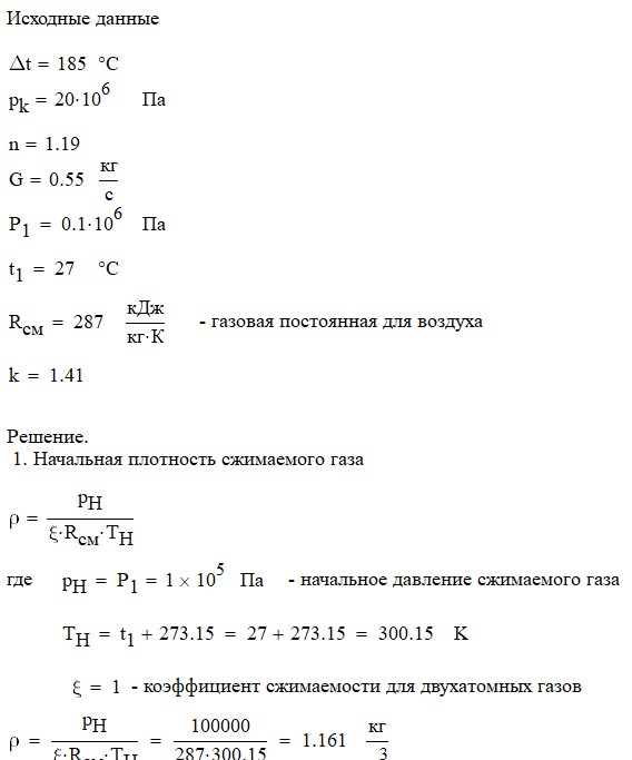 Произвести термодинамический расчет многоступенчатого поршневого компрессора, производящего G , кг в секунду сжатого до давления Рк воздуха, если предельно допустимое повышение температуры газа в каждой ступени Δt, а сжатие происходит с показателем политропы n.