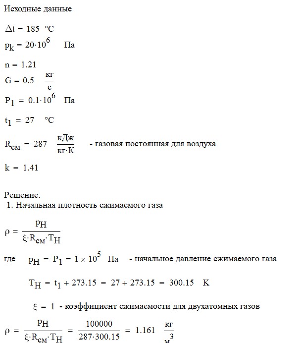 Произвести термодинамический расчет многоступенчатого поршневого компрессора, производящего G , кг в секунду сжатого до давления Рк воздуха, если предельно допустимое повышение температуры газа в каждой ступени Δt, а сжатие происходит с показателем политропы n.