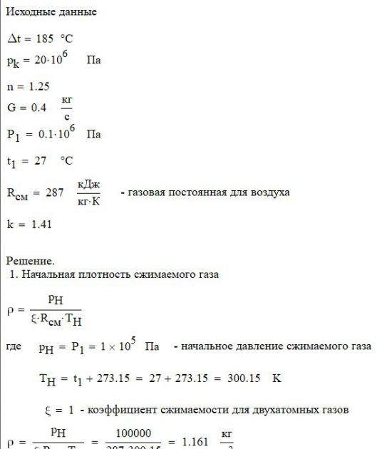Произвести термодинамический расчет многоступенчатого поршневого компрессора, производящего G , кг в секунду сжатого до давления Рк воздуха, если предельно допустимое повышение температуры газа в каждой ступени Δt, а сжатие происходит с показателем политропы n.