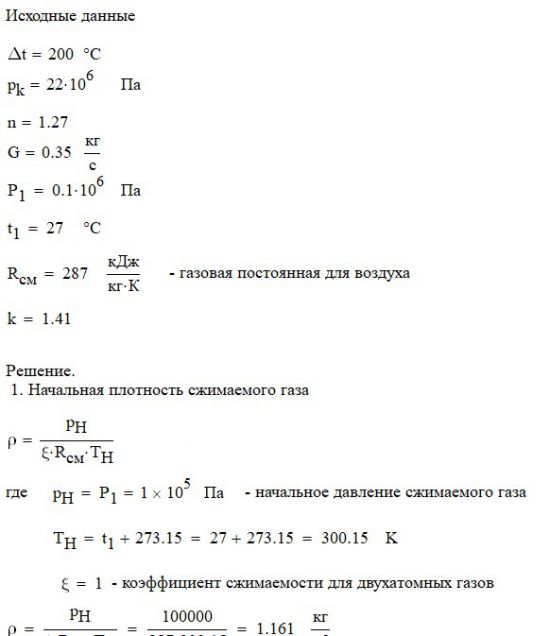 Произвести термодинамический расчет многоступенчатого поршневого компрессора, производящего G , кг в секунду сжатого до давления Рк воздуха, если предельно допустимое повышение температуры газа в каждой ступени Δt, а сжатие происходит с показателем политропы n.