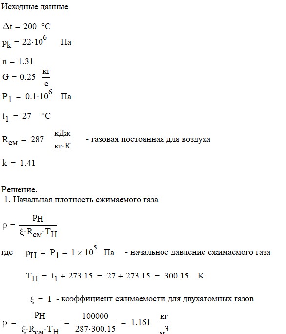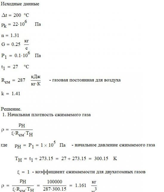 Произвести термодинамический расчет многоступенчатого поршневого компрессора, производящего G , кг в секунду сжатого до давления Рк воздуха, если предельно допустимое повышение температуры газа в каждой ступени Δt, а сжатие происходит с показателем политропы n.