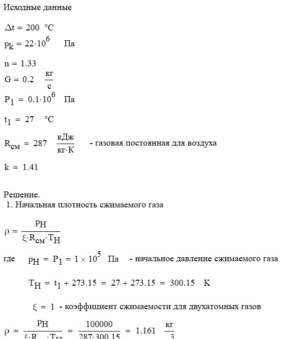 Произвести термодинамический расчет многоступенчатого поршневого компрессора, производящего G , кг в секунду сжатого до давления Рк воздуха, если предельно допустимое повышение температуры газа в каждой ступени Δt, а сжатие происходит с показателем политропы n.