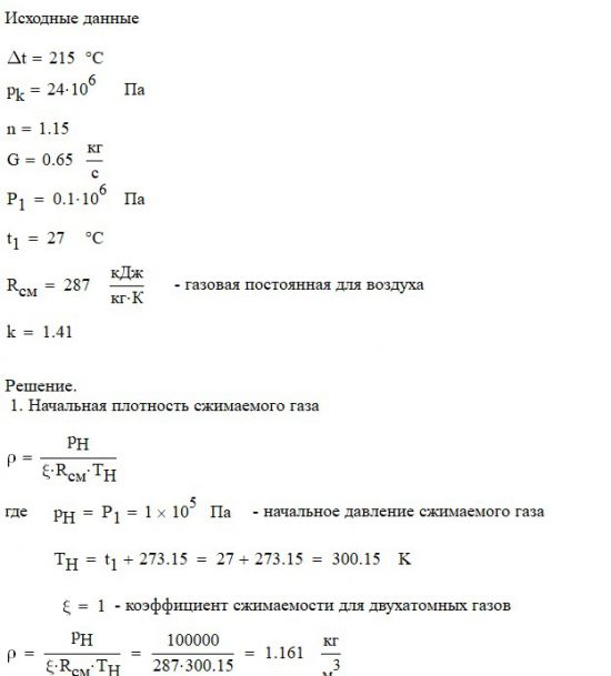 Произвести термодинамический расчет многоступенчатого поршневого компрессора, производящего G , кг в секунду сжатого до давления Рк воздуха, если предельно допустимое повышение температуры газа в каждой ступени Δt, а сжатие происходит с показателем политропы n.