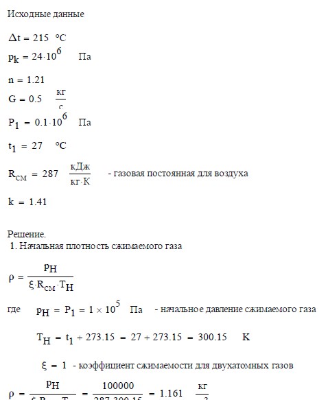Произвести термодинамический расчет многоступенчатого поршневого компрессора, производящего G , кг в секунду сжатого до давления Рк воздуха, если предельно допустимое повышение температуры газа в каждой ступени Δt, а сжатие происходит с показателем политропы n.