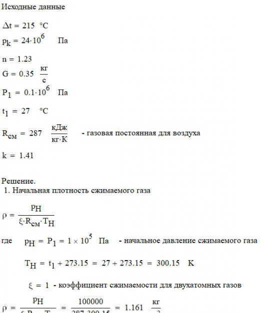 Произвести термодинамический расчет многоступенчатого поршневого компрессора, производящего G , кг в секунду сжатого до давления Рк воздуха, если предельно допустимое повышение температуры газа в каждой ступени Δt, а сжатие происходит с показателем политропы n.