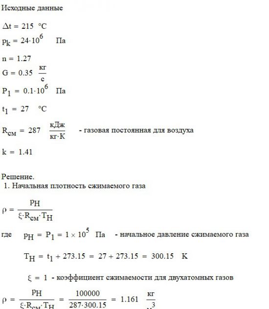 Произвести термодинамический расчет многоступенчатого поршневого компрессора, производящего G , кг в секунду сжатого до давления Рк воздуха, если предельно допустимое повышение температуры газа в каждой ступени Δt, а сжатие происходит с показателем политропы n.