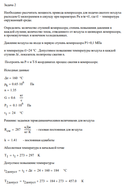 Задача 2. Необходимо рассчитать мощность привода компрессора для подачи сжатого воздуха расходом G килограммов в секунду при параметрах Pк и tк=t1, где…