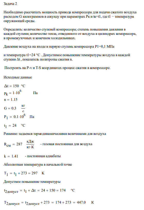 Задача 2. Необходимо рассчитать мощность привода компрессора для подачи сжатого воздуха расходом G килограммов в секунду при параметрах Pк и tк=t1, где…