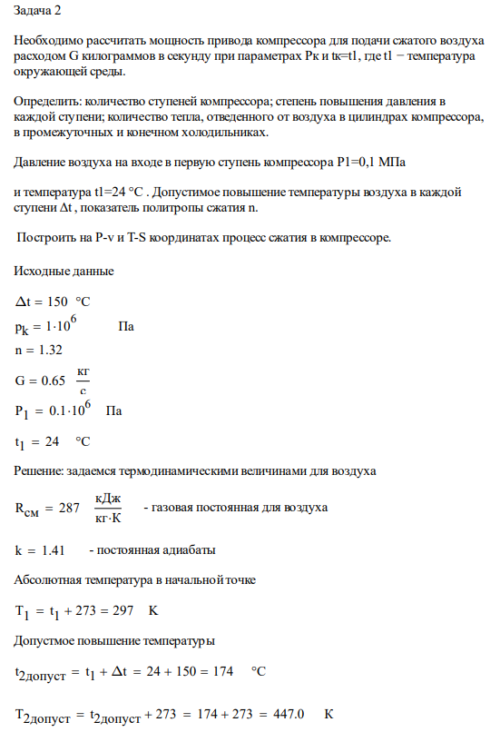 Задача 2. Необходимо рассчитать мощность привода компрессора для подачи сжатого воздуха расходом G килограммов в секунду при параметрах Pк и tк=t1, где…