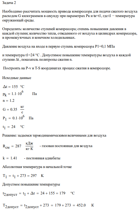 Задача 2. Необходимо рассчитать мощность привода компрессора для подачи сжатого воздуха расходом G килограммов в секунду при параметрах Pк и tк=t1, где…