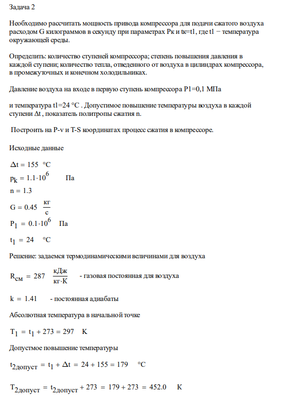 Задача 2. Необходимо рассчитать мощность привода компрессора для подачи сжатого воздуха расходом G килограммов в секунду при параметрах Pк и tк=t1, где…