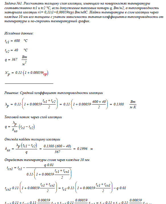 Задача №1. Рассчитать толщину слоя изоляции, имеющего на поверхностях температуры соответственно tc1 и tс2 °С, если допустимые тепловые потери q, Вт/м2, а теплопроводность материала изоляции rλ= 0,11(1+0,00059tср) Вт/м0С. Найти температуры в слое изоляции через каждые 10 мм его толщины с учетом зависимости значения коэффициента теплопроводности от температуры и построить температурный график.