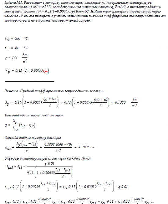 Задача №1. Рассчитать толщину слоя изоляции, имеющего на поверхностях температуры соответственно tc1 и tс2 °С, если допустимые тепловые потери q, Вт/м2, а теплопроводность материала изоляции rλ= 0,11(1+0,00059tср) Вт/м0С. Найти температуры в слое изоляции через каждые 10 мм его толщины с учетом зависимости значения коэффициента теплопроводности от температуры и построить температурный график.