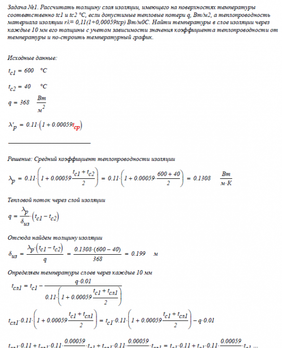 Задача №1. Рассчитать толщину слоя изоляции, имеющего на поверхностях температуры соответственно tc1 и tс2 °С, если допустимые тепловые потери q, Вт/м2, а теплопроводность материала изоляции rλ= 0,11(1+0,00059tср) Вт/м0С. Найти температуры в слое изоляции через каждые 10 мм его толщины с учетом зависимости значения коэффициента теплопроводности от температуры и построить температурный график.
