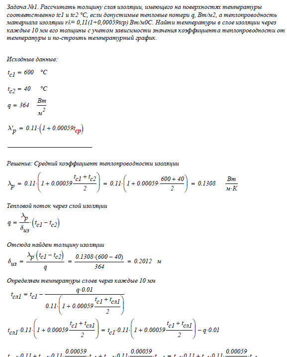 Задача №1. Рассчитать толщину слоя изоляции, имеющего на поверхностях температуры соответственно tc1 и tс2 °С, если допустимые тепловые потери q, Вт/м2, а теплопроводность материала изоляции rλ= 0,11(1+0,00059tср) Вт/м0С. Найти температуры в слое изоляции через каждые 10 мм его толщины с учетом зависимости значения коэффициента теплопроводности от температуры и построить температурный график.