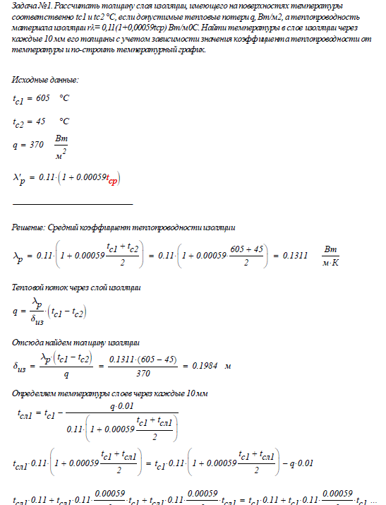 Задача №1. Рассчитать толщину слоя изоляции, имеющего на поверхностях температуры соответственно tc1 и tс2 °С, если допустимые тепловые потери q, Вт/м2, а теплопроводность материала изоляции rλ= 0,11(1+0,00059tср) Вт/м0С. Найти температуры в слое изоляции через каждые 10 мм его толщины с учетом зависимости значения коэффициента теплопроводности от температуры и построить температурный график.