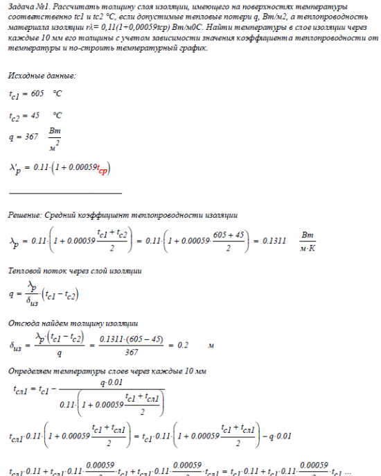 Задача №1. Рассчитать толщину слоя изоляции, имеющего на поверхностях температуры соответственно tc1 и tс2 °С, если допустимые тепловые потери q, Вт/м2, а теплопроводность материала изоляции rλ= 0,11(1+0,00059tср) Вт/м0С. Найти температуры в слое изоляции через каждые 10 мм его толщины с учетом зависимости значения коэффициента теплопроводности от температуры и построить температурный график.