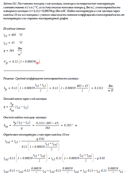 Задача №1. Рассчитать толщину слоя изоляции, имеющего на поверхностях температуры соответственно tc1 и tс2 °С, если допустимые тепловые потери q, Вт/м2, а теплопроводность материала изоляции rλ= 0,11(1+0,00059tср) Вт/м0С. Найти температуры в слое изоляции через каждые 10 мм его толщины с учетом зависимости значения коэффициента теплопроводности от температуры и построить температурный график.