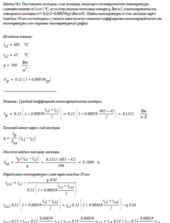 Задача №1. Рассчитать толщину слоя изоляции, имеющего на поверхностях температуры соответственно tc1 и tс2 °С, если допустимые тепловые потери q, Вт/м2, а теплопроводность материала изоляции rλ= 0,11(1+0,00059tср) Вт/м0С. Найти температуры в слое изоляции через каждые 10 мм его толщины с учетом зависимости значения коэффициента теплопроводности от температуры и построить температурный график.