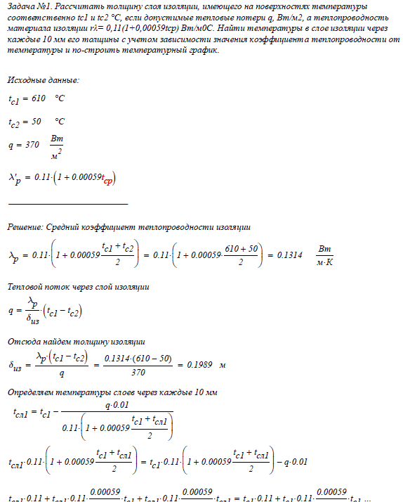 Задача №1. Рассчитать толщину слоя изоляции, имеющего на поверхностях температуры соответственно tc1 и tс2 °С, если допустимые тепловые потери q, Вт/м2, а теплопроводность материала изоляции rλ= 0,11(1+0,00059tср) Вт/м0С. Найти температуры в слое изоляции через каждые 10 мм его толщины с учетом зависимости значения коэффициента теплопроводности от температуры и построить температурный график.