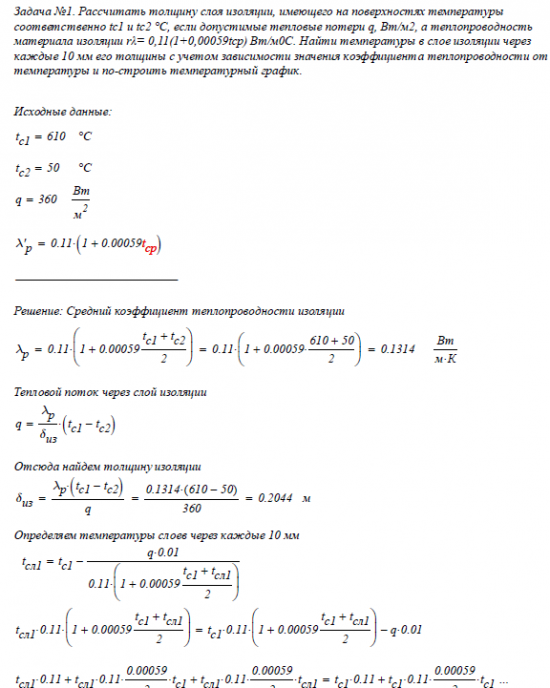 Задача №1. Рассчитать толщину слоя изоляции, имеющего на поверхностях температуры соответственно tc1 и tс2 °С, если допустимые тепловые потери q, Вт/м2, а теплопроводность материала изоляции rλ= 0,11(1+0,00059tср) Вт/м0С. Найти температуры в слое изоляции через каждые 10 мм его толщины с учетом зависимости значения коэффициента теплопроводности от температуры и построить температурный график.