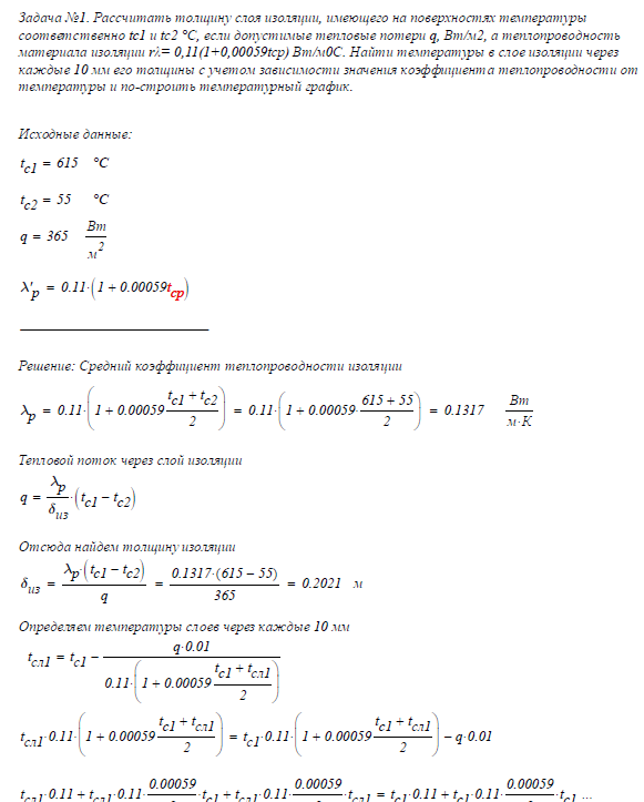 Задача №1. Рассчитать толщину слоя изоляции, имеющего на поверхностях температуры соответственно tc1 и tс2 °С, если допустимые тепловые потери q, Вт/м2, а теплопроводность материала изоляции rλ= 0,11(1+0,00059tср) Вт/м0С. Найти температуры в слое изоляции через каждые 10 мм его толщины с учетом зависимости значения коэффициента теплопроводности от температуры и построить температурный график.