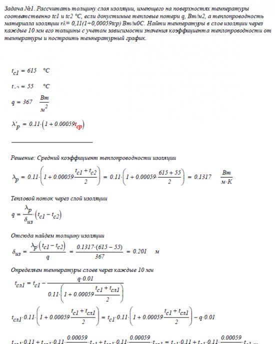 Задача №1. Рассчитать толщину слоя изоляции, имеющего на поверхностях температуры соответственно tc1 и tс2 °С, если допустимые тепловые потери q, Вт/м2, а теплопроводность материала изоляции rλ= 0,11(1+0,00059tср) Вт/м0С. Найти температуры в слое изоляции через каждые 10 мм его толщины с учетом зависимости значения коэффициента теплопроводности от температуры и построить температурный график.