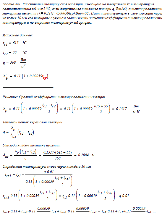 Задача №1. Рассчитать толщину слоя изоляции, имеющего на поверхностях температуры соответственно tc1 и tс2 °С, если допустимые тепловые потери q, Вт/м2, а теплопроводность материала изоляции rλ= 0,11(1+0,00059tср) Вт/м0С. Найти температуры в слое изоляции через каждые 10 мм его толщины с учетом зависимости значения коэффициента теплопроводности от температуры и построить температурный график.