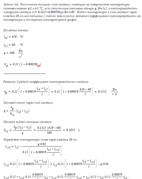 Задача №1. Рассчитать толщину слоя изоляции, имеющего на поверхностях температуры соответственно tc1 и tс2 °С, если допустимые тепловые потери q, Вт/м2, а…