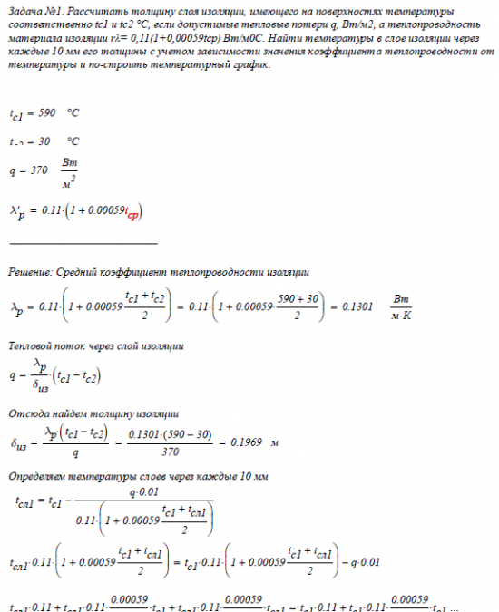 Задача №1. Рассчитать толщину слоя изоляции, имеющего на поверхностях температуры соответственно tc1 и tс2 °С, если допустимые тепловые потери q, Вт/м2, а теплопроводность материала изоляции rλ= 0,11(1+0,00059tср) Вт/м0С. Найти температуры в слое изоляции через каждые 10 мм его толщины с учетом зависимости значения коэффициента теплопроводности от температуры и построить температурный график.