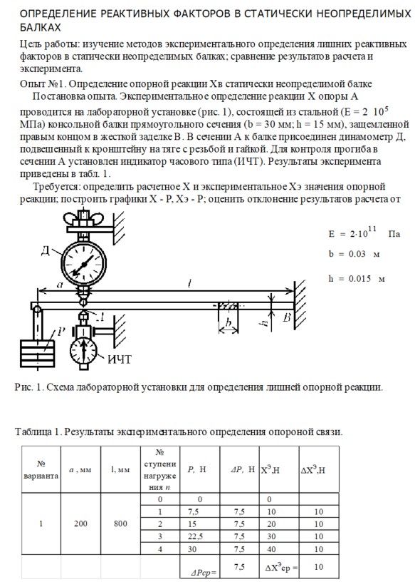Цель работы: изучение методов экспериментального определения лишних реактивных факторов в статически неопределимых балках; сравнение результатов расчета и эксперимента.