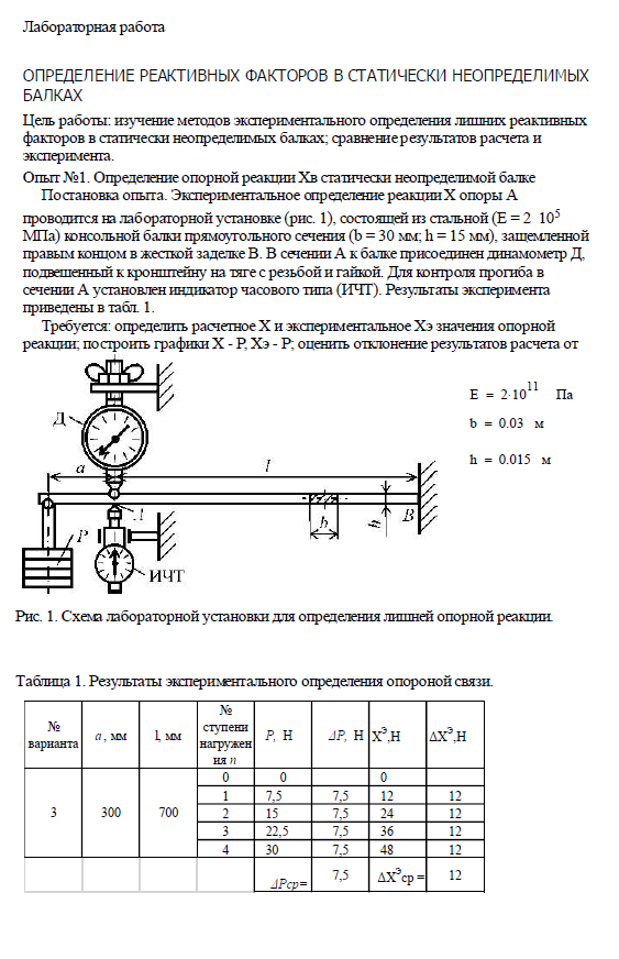 Цель работы: изучение методов экспериментального определения лишних реактивных факторов в статически неопределимых балках; сравнение результатов расчета и эксперимента.