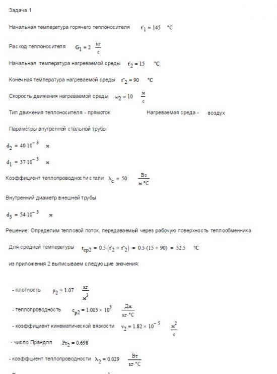 Задача №1. В теплообменном аппарате типа «труба в трубе» греющая вода с температурой t1' (0С) и расходом G1 (кг/с) движется по внутренней стальной трубе диаметром d2/d1=40/37 мм. Коэффициент теплопроводности стали λ=50 Вт/м 0С. Нагреваемая среда движется по кольцевому зазору между трубами со скоростью ω2 (м/с) и нагревается от температуры t2' (0С) до t2" (0С). Внутренний диаметр внешней трубы d3=54 мм.