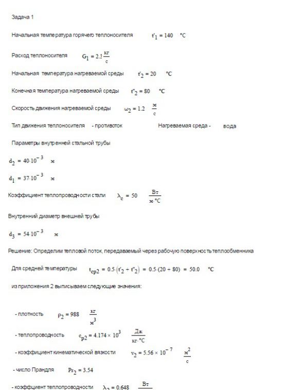 Задача №1. В теплообменном аппарате типа «труба в трубе» греющая вода с температурой t1' (0С) и расходом G1 (кг/с) движется по внутренней стальной трубе диаметром d2/d1=40/37 мм. Коэффициент теплопроводности стали λ=50 Вт/м 0С. Нагреваемая среда движется по кольцевому зазору между трубами со скоростью ω2 (м/с) и нагревается от температуры t2' (0С) до t2" (0С). Внутренний диаметр внешней трубы d3=54 мм.