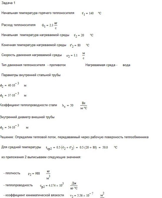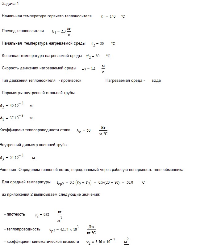 Задача №1. В теплообменном аппарате типа «труба в трубе» греющая вода с температурой t1' (0С) и расходом G1 (кг/с) движется по внутренней стальной трубе диаметром d2/d1=40/37 мм. Коэффициент теплопроводности стали λ=50 Вт/м 0С. Нагреваемая среда движется по кольцевому зазору между трубами со скоростью ω2 (м/с) и нагревается от температуры t2' (0С) до t2" (0С). Внутренний диаметр внешней трубы d3=54 мм.