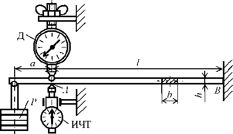 Постановка опыта. Экспериментальное определение реакции X опоры А проводится на лабораторной установке (рис. 1), состоящей из стальной (Е = 2 105 МПа) консольной балки прямоугольного сечения (b = 30 мм; h = 15 мм), защемленной правым концом в жесткой заделке В. В сечении А к балке присоединен динамометр Д, подвешенный к кронштейну на тяге с резьбой и гайкой. Для контроля прогиба в сечении А установлен индикатор часового типа (ИЧТ). Результаты эксперимента приведены в табл. 1.