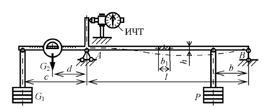 Постановка опыта. Экспериментальное определение опорного момента Мa проводится на лабораторной установке (рис. 3), состоящей из стальной (Е = 2 * 105 МПа) балки прямоугольного сечения (b1 = 40 мм; h = 5 мм) длиной l = 800 мм и специального рычажного устройства с грузами G1 , G2, имитирующего жесткое закрепление левого конца балки. Для регистрации угла поворота опорного сечения А установлен индикатор часового типа (ИЧТ). Результаты эксперимента приведены в табл. 2.