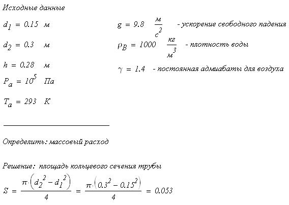 Вентилятор всасывает атмосферный воздух через кольцевую трубу с внутренним диаметром d1 = 150 мм и внешним диаметром d2 = 300 мм. Статистическое давление воздуха в трубе измеряется с помощью водяного дифференциального манометра, причѐм разность уровней h равна 280 мм. Атмосферное давление Ра=1·10 Па, температура воздуха Та =293 К. Найти массовый расход m воздуха. Течение считать одномерным, влиянием трения пренебречь.