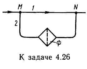 Задача 4.26. Трубопровод с расходом жидкости Q = = 0,32 л/с в точке М разветвляется на два трубопровода: 1-й размерами l1 = l,0 м, d1 = 10 мм; 2-й размерами l2 = = 2,0 м, d2 = 8 мм. В точке N эти трубопроводы смыкаются. Во 2-м трубопроводе установлен фильтр Ф, сопротивление которого эквивалентно трубе длиной lэ = 200 d2. Определить расход и потерю давления в каждом трубопроводе при р = = 900 кг/м3 и v=l Ст.