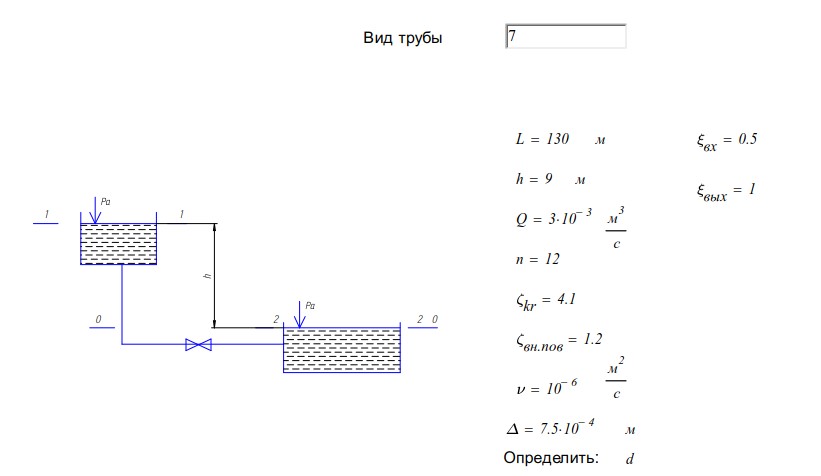 Вода при 20оС (v = 10-6 м2/с) вытекает из верхнего бака в нижний через трубопровод длиной L, имеющий n резких поворотов и один вентиль (ζв), с расходом Q. Разность уровней в баках равна h. Найти необходимый для пропускания такого расхода внутренний диаметр трубопровода d. Вид трубы 5 - старые стальные сварные. Задачу решить графоаналитическим методом. Полученное значение d выразить в м и мм.
