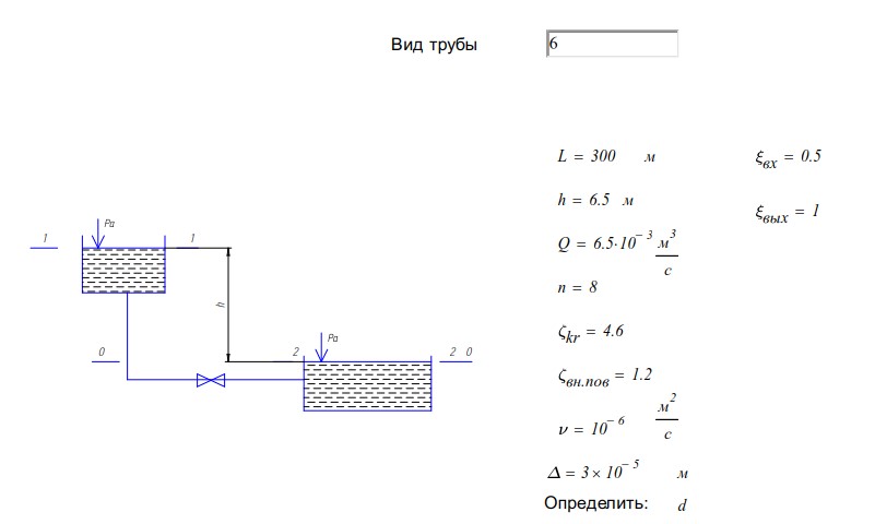 Вода при 20оС (v = 10-6 м2/с) вытекает из верхнего бака в нижний через трубопровод длиной L, имеющий n резких поворотов и один вентиль (ζв), с расходом Q. Разность уровней в баках равна h. Найти необходимый для пропускания такого расхода внутренний диаметр трубопровода d. Вид трубы 5 - старые стальные сварные. Задачу решить графоаналитическим методом. Полученное значение d выразить в м и мм.