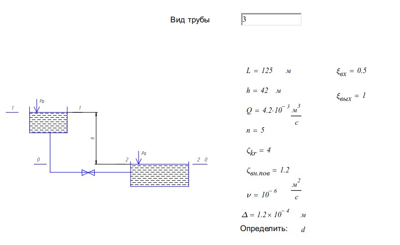 Вода при 20оС (v = 10-6 м2/с) вытекает из верхнего бака в нижний через трубопровод длиной L, имеющий n резких поворотов и один вентиль (ζв), с расходом Q. Разность уровней в баках равна h. Найти необходимый для пропускания такого расхода внутренний диаметр трубопровода d. Вид трубы 5 - старые стальные сварные. Задачу решить графоаналитическим методом. Полученное значение d выразить в м и мм.