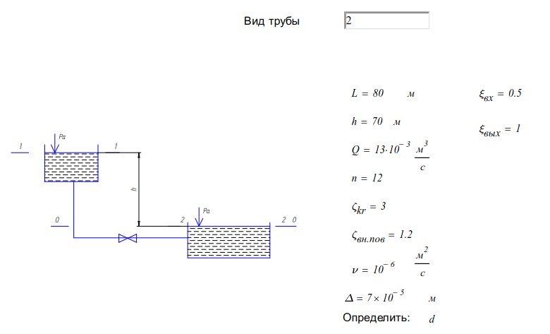 Вода при 20оС (v = 10-6 м2/с) вытекает из верхнего бака в нижний через трубопровод длиной L, имеющий n резких поворотов и один вентиль (ζв), с расходом Q. Разность уровней в баках равна h. Найти необходимый для пропускания такого расхода внутренний диаметр трубопровода d. Вид трубы 5 - старые стальные сварные. Задачу решить графоаналитическим методом. Полученное значение d выразить в м и мм.