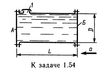 Цилиндрический сосуд, заполненный жидкостью с плотностью ρ = 900 кг/м 3, движется с ускорением а = 4g. Определить силы, действующие на крышки А и Б, если L = 1 м и D = 0,5 м. Избыточное давление в точке 1 считать равным нулю.