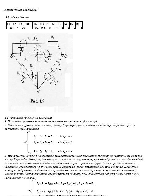 1. Составить систему уравнений, необходимых для определения токов по первому и второму законам Кирхгофа;