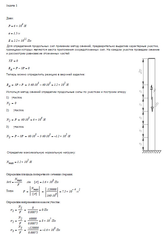 Задача 1 Для стержня (рис. 1) постоянного сечения следует: 1. Построить эпюру продольных сил N, напряжений σ, относительных деформаций ε и…