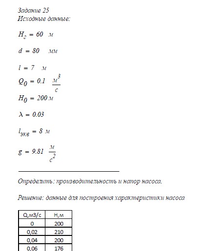 25. Определить производительность и напор насоса (рабочую точку) при подаче воды в открытый резервуар из колодца на геодезическую высоту H по трубопроводу…