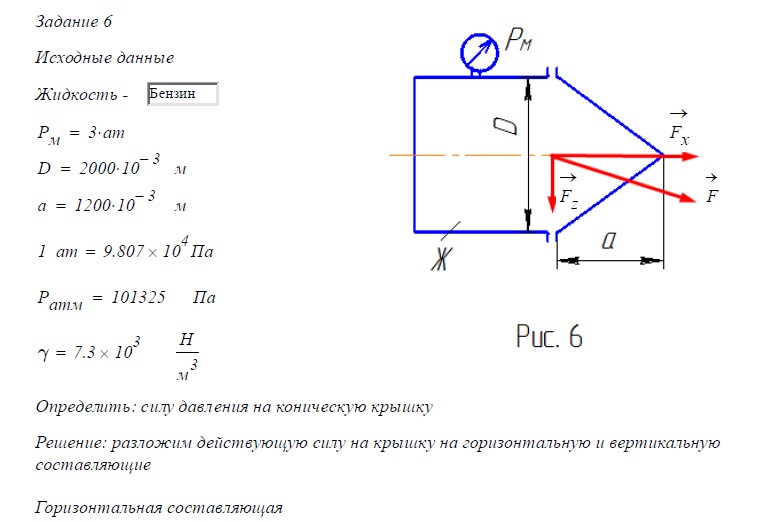 Определить силу давления на коническую крышку горизонтального цилиндрического сосуда диаметром D, заполненного жидкостью Ж (рис.6). Показания манометра в точке его присоединения - рм. Показать на чертеже вертикальную и горизонтальную составляющие, а также полную силу давления.